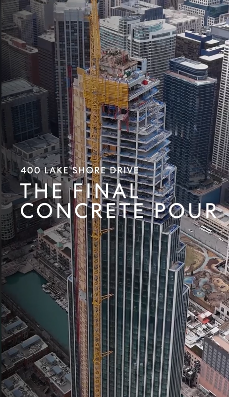 Crews have completed the final concrete pour at 400 Lake Shore Drive, where crews have completed the final concrete pour, marking the full build-out of the tower’s primary structural frame.