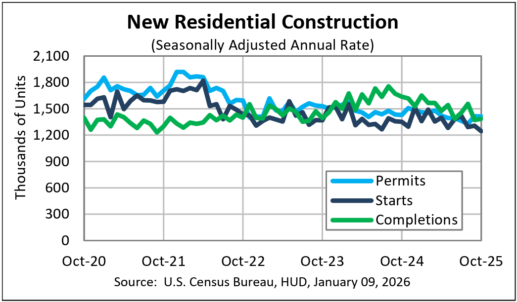 Building permits for new homes were issued at a seasonally adjusted annual rate of 1,412,000, down 0.2% from September’s revised rate of 1,415,000 and 1.1% below October 2024, when 1,428,000 permits were issued. Single-family permits were at a rate of 876,000, 0.5% below September, while permits for buildings with five or more units were 481,000.
